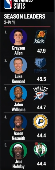 神射手格雷森-阿伦三分命中率高达47.9% 领先次席2.4个百分点