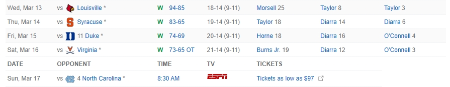 北卡州立大学在ACC锦标赛中势如破竹,他们4天内取得4连胜闯进冠军赛。这是史上第二次有两位数种子队进入ACC锦标赛冠军赛,上一次是2007年。值得一提的是,那次冠军赛也是10号种子北卡州立大学对阵1号种子北卡大学,北卡州立最终80-89不敌北卡大学。