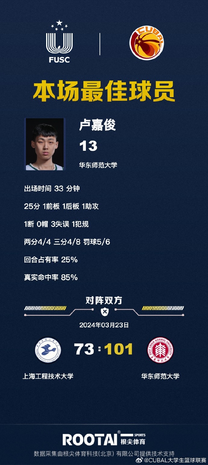 末节比赛,上海工程奋力反击,连投带罚打出10-0的攻击波缩小分差,又是丁超三分稳住局势,此后华东师大轮番冲击内线拿分继续扩大优势,最终,华东师大101-73轻取上海工程,获得胜利。