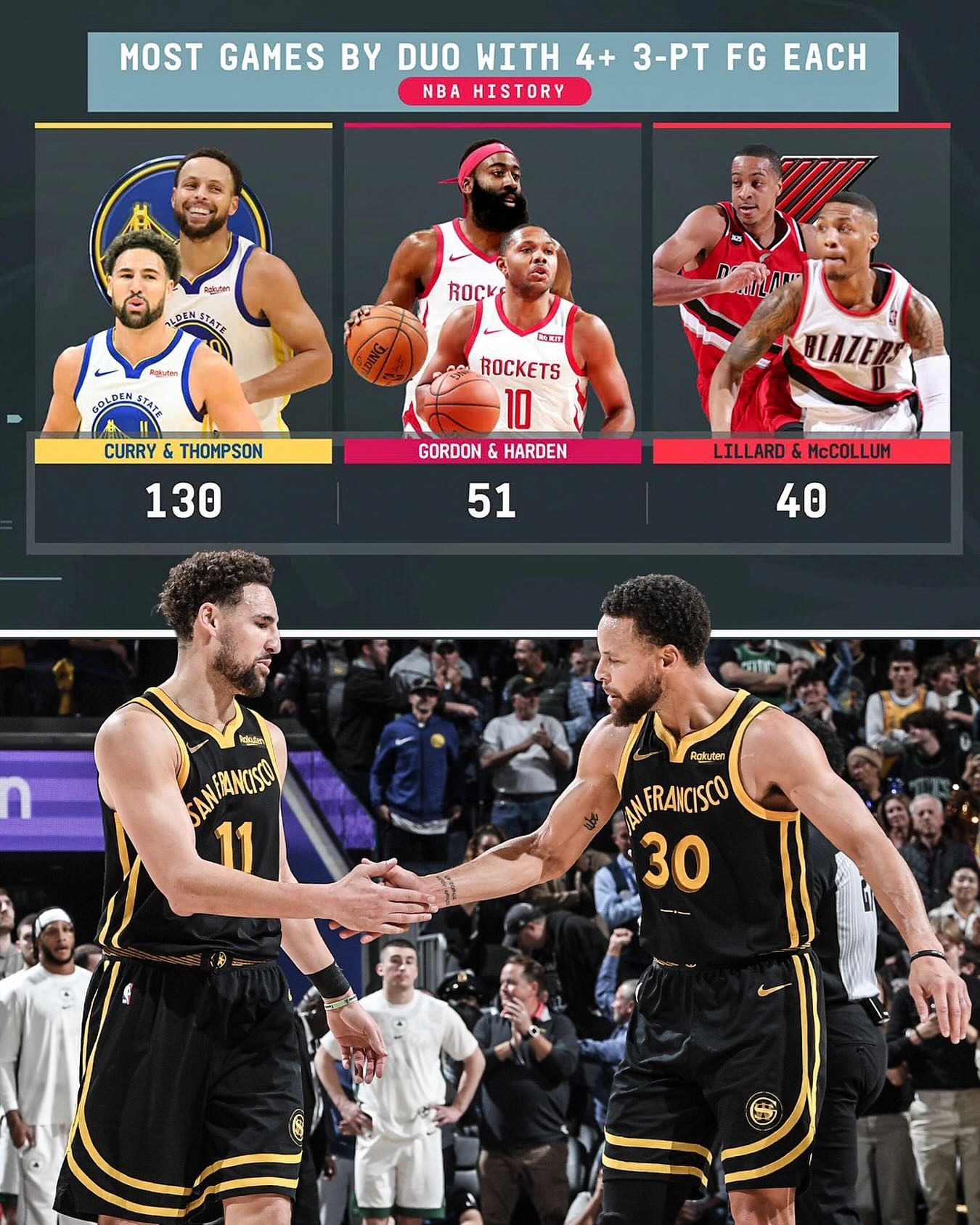 库里今天三分7中4;克莱11中5水花组合130次,哈登&戈登51次,利拉德CJ40次...