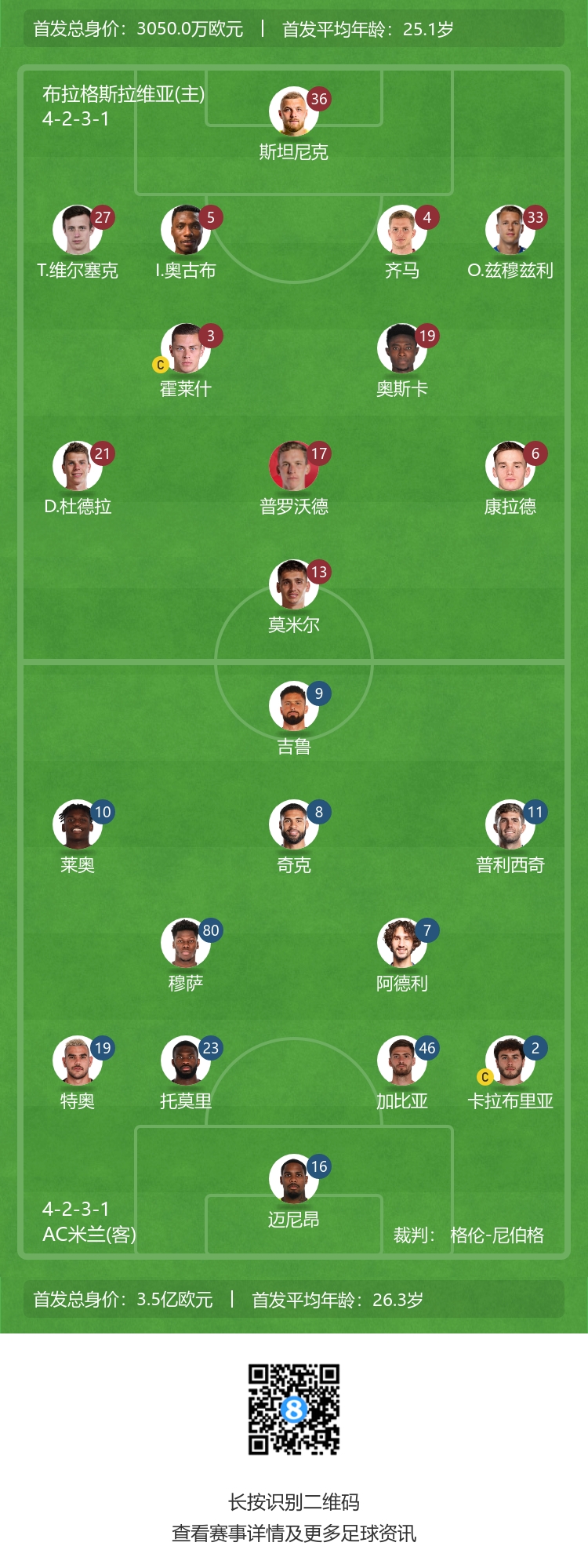 米兰首发:16-迈尼昂、2-卡拉布里亚、19-特奥、23-托莫里、46-加比亚、80-穆萨、7-阿德利、8-奇克、11-普利西奇、10-莱奥、9-吉鲁