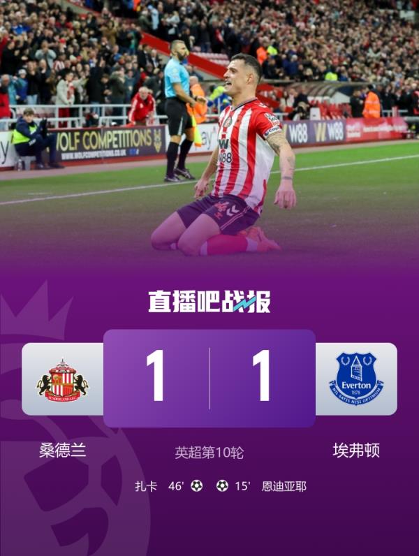 恩迪亚耶破门首开记录,扎卡抽射破门扳平比分,基恩禁区手球未判罚,最终桑德兰1-1埃弗顿升第4。