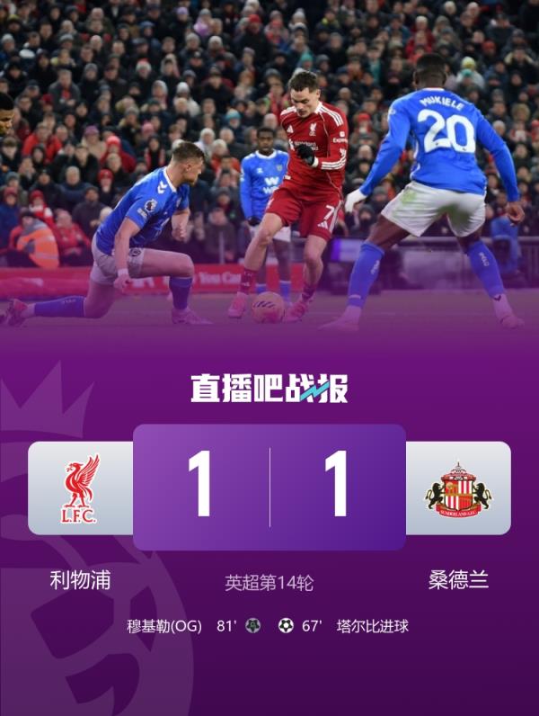 英超联赛第14轮,利物浦1-1桑德兰,维尔茨造乌龙,范戴克失误。
