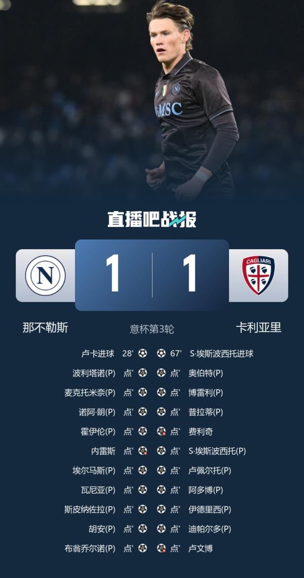 意杯第3轮,那不勒斯点球大战战胜卡利亚里,晋级8强。