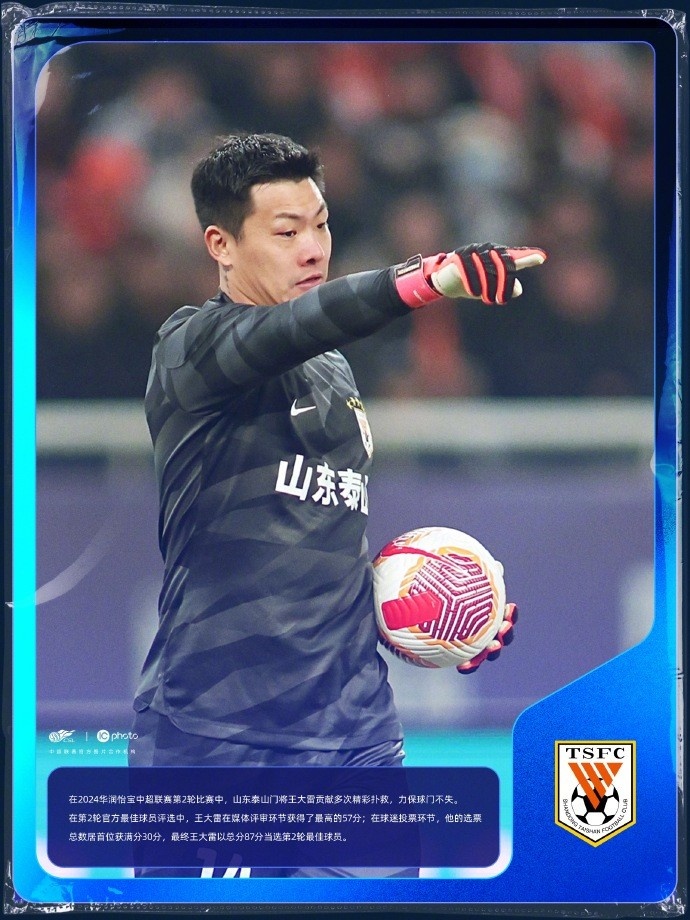 在山东泰山第2轮0-0战平北京国安的比赛中,王大雷4次被射正贡献4次扑救,扑救成功率为100%,他同时还完成1次解围,最终当选中超第2轮最佳球员。