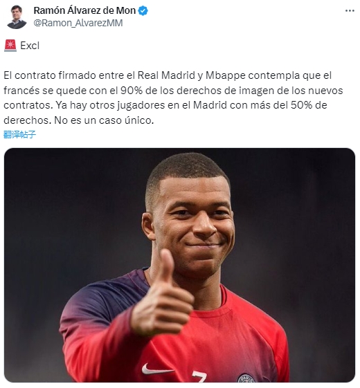 该记者表示,在皇马与姆巴佩的合同中规定,姆巴佩可以保留90%的肖像权。这在皇马不是个例,已经有其他皇马球员保留了超过50%的肖像权。