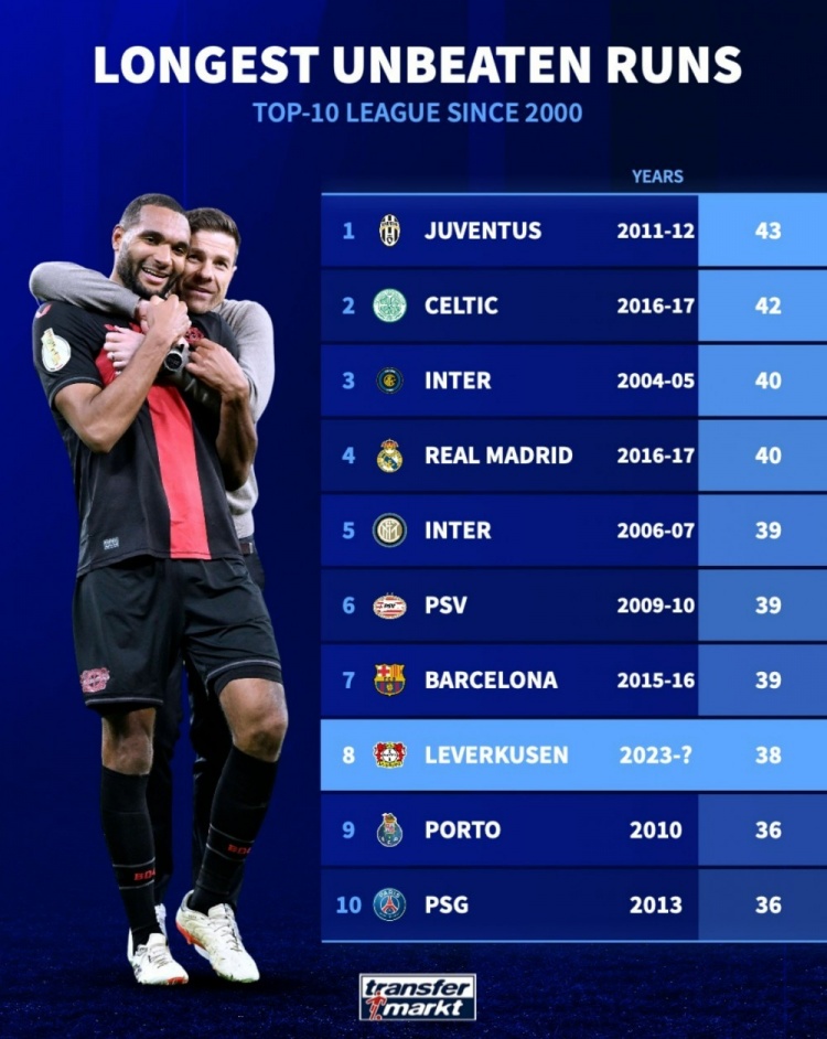 3月20日讯 本赛季勒沃库森势不可挡,目前已经保持连续38场各项赛事不败。德转也盘点了自2000年欧洲前十联赛球队最长不败纪录,以下为具体榜单: