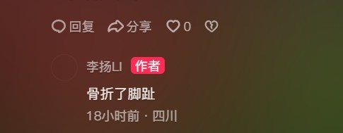 李扬在个人社交媒体中写道:等我回来,一起战斗!此外,李扬还在社媒评论区透露,自己脚趾骨折。